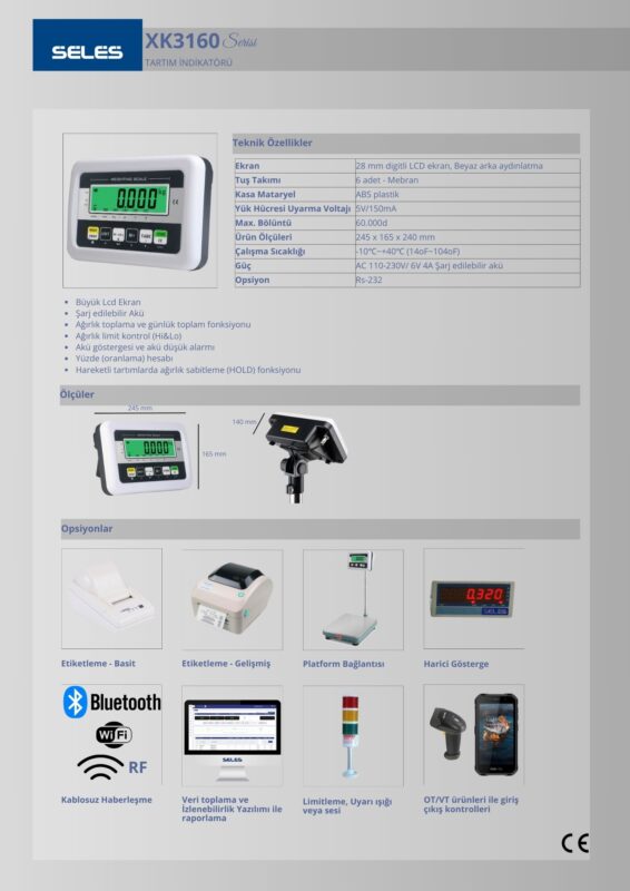 Seles XK3160 Serisi Tartım Baskülleri, yüksek hassasiyet performansı ile doğru tartım ve ihtiyaca uygun kapasite & hassasiyet seçenekleri ile tüm sektörlere hitap etmektedir.